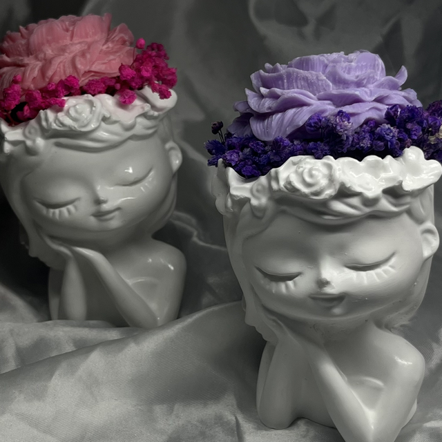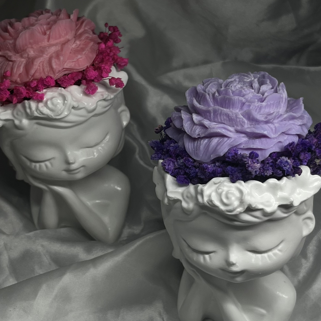 Un bouquet de fleurs en fondant parfumé , délicatement façonné qui s’épanouit dans un vase en forme de jeune fille. La silhouette gracieuse, toute en douceur et en poésie, devient l’écrin d’une composition florale qui ne se fane jamais. Alliance d’art et de raffinement, cette pièce unique évoque la tendresse, la beauté et l’éternité d’un instant figé dans la cire.